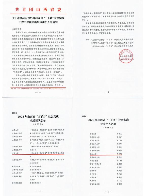 近日,共青团山西省委发布《关于通报表扬2023年山西省“三下乡”社会实践工作中表现突出集体和个人的通知》,yabo888vip网页版登录“丹心太行.筑梦小镇”团学骨干暑期社会实践团荣获“2023年山西省‘三下乡’社会实践优秀团队”荣誉称号,yabo888vip网页版登录赵宇鹏同学荣获“2023年山西省‘三下乡’社会实践优秀个人”荣誉称号。