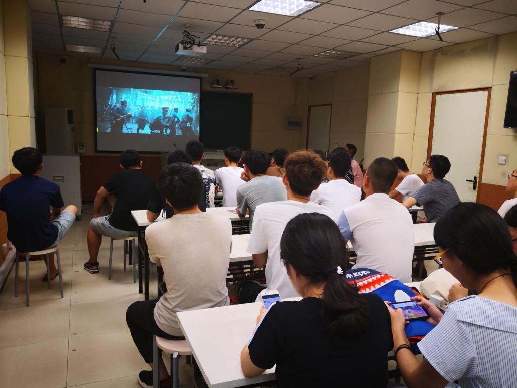 之后, 开始观影,这次观看的影片是《建军大业》这部电影是“建国三部曲”系列的第三部,献礼建军90周年的历史片,该片讲述了1927年第一次国内革命战争失败后,中国共产党挽救革命,于当年8月1日在江西南昌举行武装起义,从而创建中国共产党领导的人民军队的故事。影片分成三部分:“四·一二反革命”、“南昌起义”和“三河坝战役”。