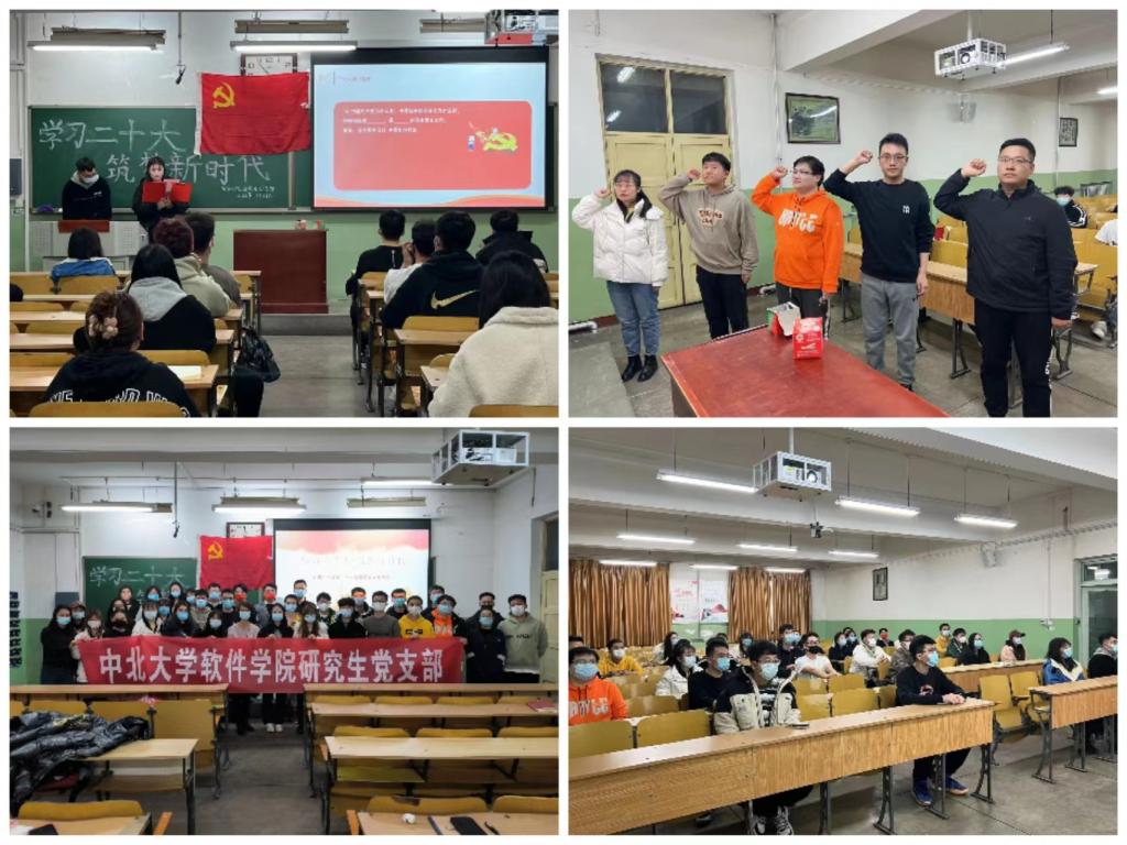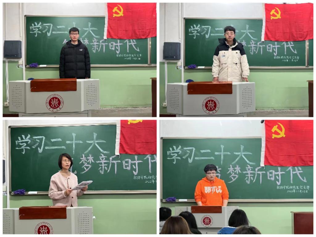 本次活动由新党员入党宣誓、二十大精神解读与学习、支部书记领学、二十大知识竞赛等四部分组成。活动开始,支部委员汤秉锦同志带领新加入党组织的五位同志进行了入党宣誓。之后,支部三位党员同志结合自身学习体会,分别从二十大报告中提出的指导思想、使命任务,科教兴国、生态环境,经济建设、党的建设等方面对二十大精神进行了解读。接下来,支部书记魏跃亲老师针对二十大报告中出现的部分重要论述和关键词进行了重点解读;并要求大家要带着极大的政治热情,用心感受、深刻领会二十大报告的丰富内涵和精神实质。最后,在主持人贾媛媛的组织下,全体党员踊跃参加了二十大知识竞赛活动,并将自己的所学与同学们进行了分享。