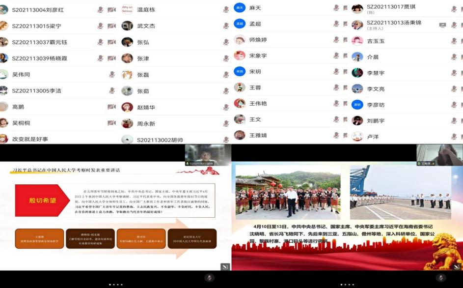 活动中,汤秉锦同志首先带领大家一起观看了习近平总书记在人民大学、海南等地考察时的重要讲话视频内容;接着胡帅同志分享了自己学习习近平总书记在人民大学考察时发表的重要讲话内容心得,提醒大家始终牢记党的教诲,立志民族复兴,不负韶华,不负时代,不负人民,在青春的赛道上奋力奔跑,争取跑出当代青年的最好成绩;最后,王雅婧同志带领大家学习了习近平总书记海南考察时重要讲话精神,习近平总书记指出要以全面贯彻新发展理念,全面深化改革开放理论加快建设具有世界影响力的中国特色自由贸易港,让海南成为新时代中国改革开放的示范。